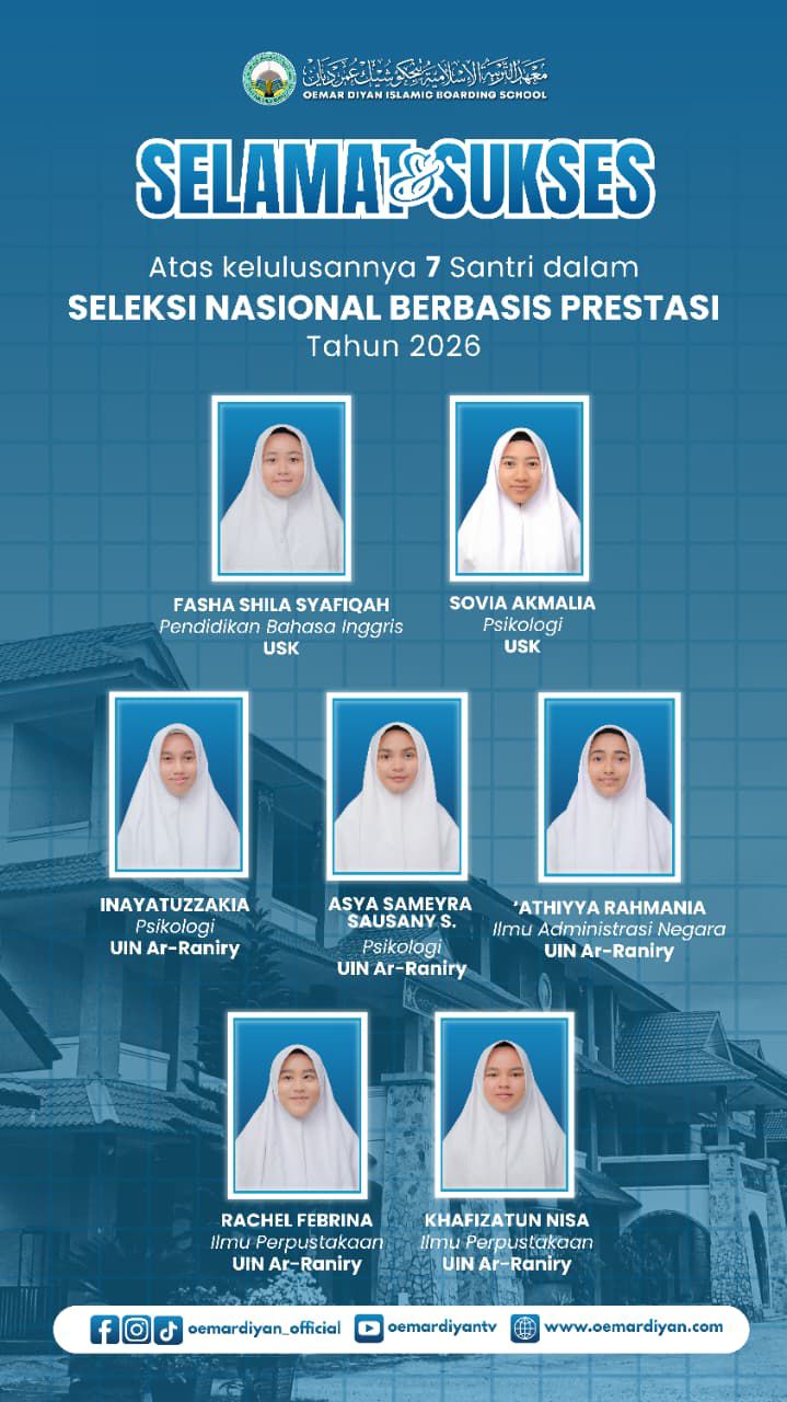 FaktaBatamNews.Com. Aceh Besar-MAS Tgk Chiek Oemar Diyan kembali mencatatkan prestasi akademik. Tujuh santri dinyatakan lulus pada Seleksi Nasional Berdasarkan Prestasi (SNBP) Tahun 2026 dan diterima di berbagai program studi pada perguruan tinggi negeri di Aceh.