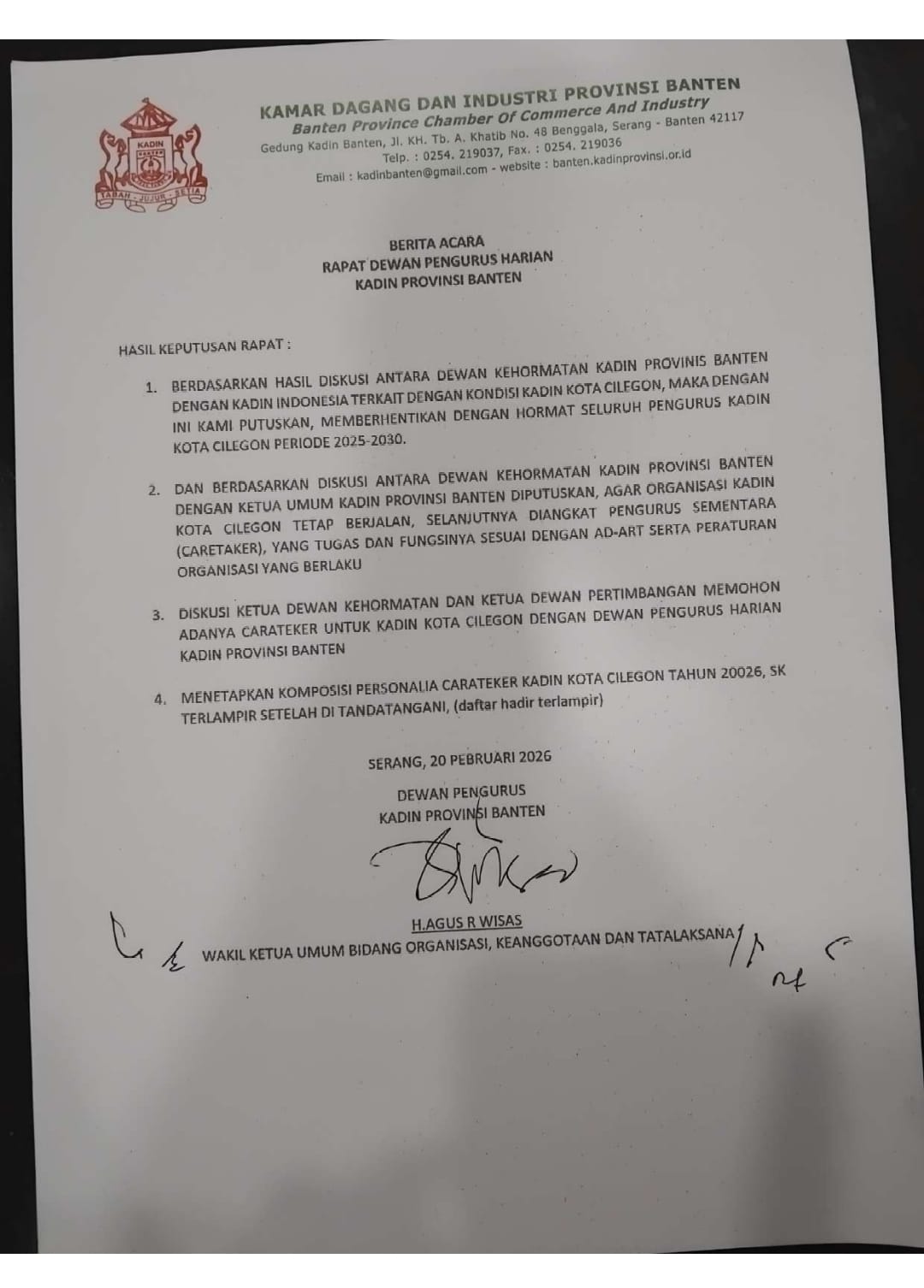 FaktaBatamNews.com, Cilegon – Pasca melaksanakan Rapat Pengurus Lengkap (RPL) yang diselenggarakan 14 Februari 2026 lalu, Pengurus Kamar Dagang Industri (KADIN) Kota Cilegon resmi diberhentikan.