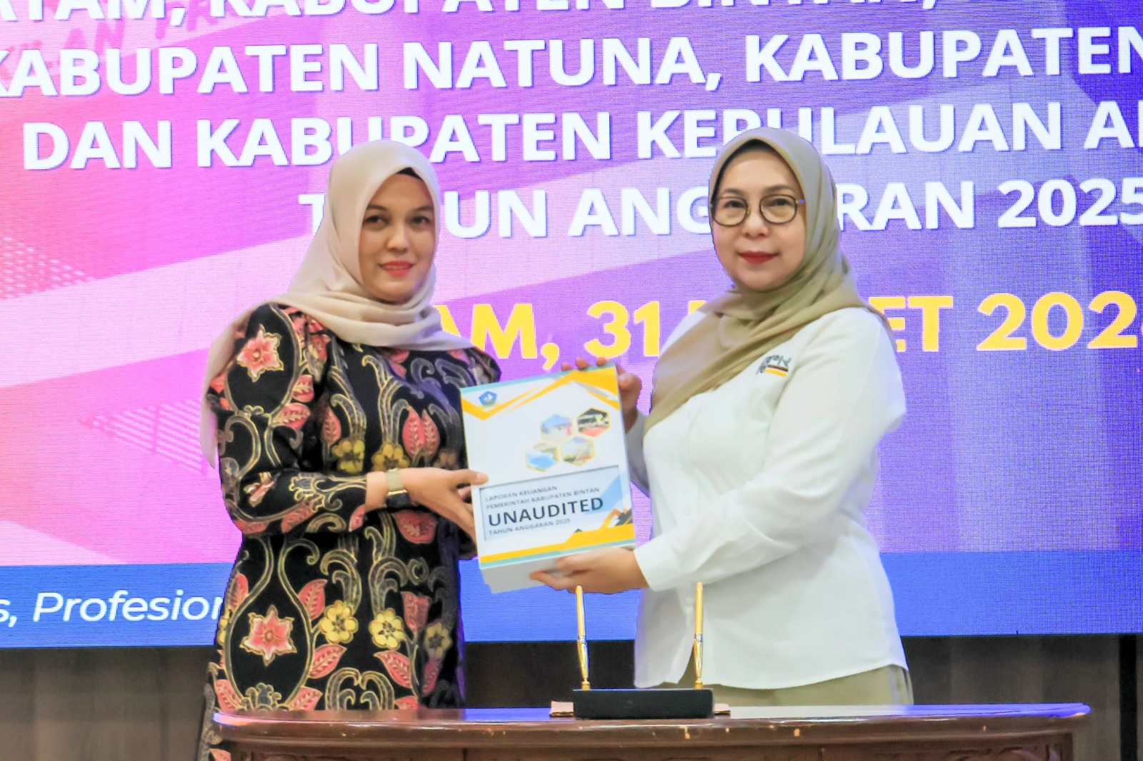 FaktaBatamNews.com, Wakil Bupati Bintan, Deby Maryanti menyerahkan Laporan Keuangan Pemerintah Daerah (LKPD) Kabupaten Bintan Unaudited Tahun Anggaran 2025 ke Badan Pemeriksa Keuangan (BPK) RI Perwakilan Kepri, Selasa (31/3) di Auditorium BPK RI Perwakilan Kepri, Kota Batam.