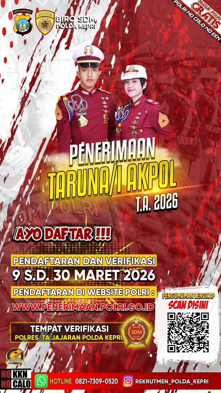 FaktaBatamNews.com, Batam-Kepolisian Daerah Kepulauan Riau mengajak putra-putri terbaik di wilayah Kepulauan Riau untuk bergabung menjadi anggota Polri melalui Penerimaan Terpadu Anggota Polri Tahun Anggaran 2026 yang meliputi jalur Taruna Akademi Kepolisian (Akpol), Bintara Polri, dan Tamtama Polri.